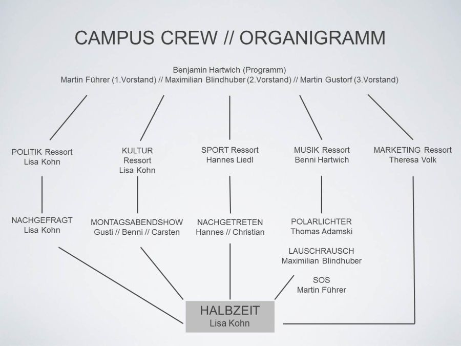 Einen Überblick über alle Sendungen erhältst du hier: http://www.campuscrew-passau.de/sendeplan/. Folgende Aufgabenbereiche und Ressorts gibt es.